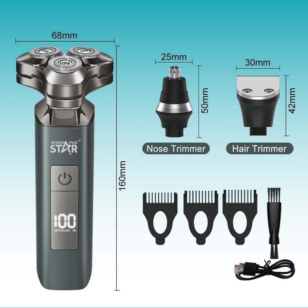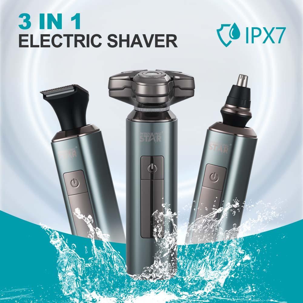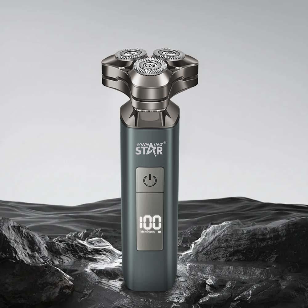 ماكينة حلاقة كهربائية دوّارة ثلاثية من ويننج ستار ST-5842، بقدرة 5 وات / 5 فولت، مزوّدة ببطارية ليثيوم 14500 بسعة 800 mAh، وأداء يصل إلى 120 دقيقة بعد شحن لمدة ساعتين، مقاومة للماء وفق معيار IPX7، مصنوعة من سبيكة الألمنيوم، تشمل تذكيرًا بالشحن والتنظيف، ومثالية للوجه والسفرّ، بتصميم متين وأنيق.