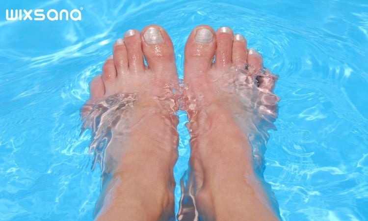 - يتم وضع القدم في ماء فاتر لمدة لا تقل عن 10 دقائق.
